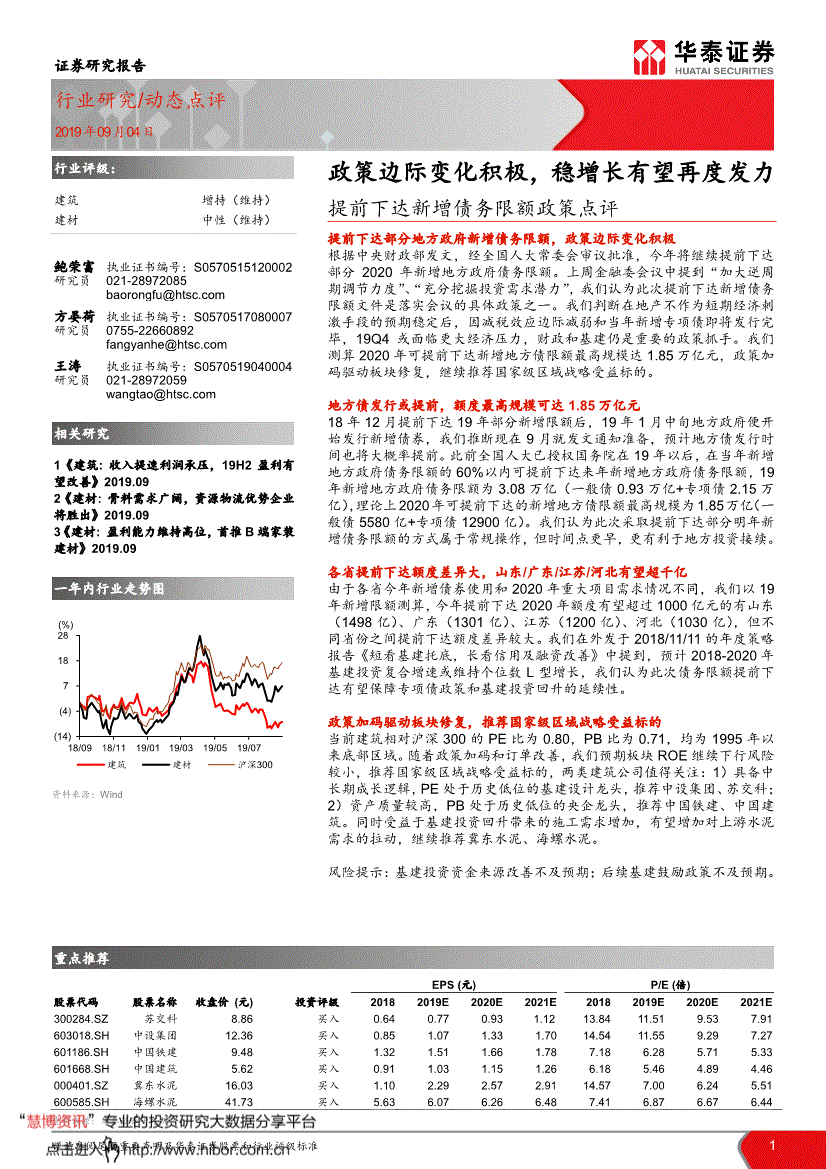 全资子公司华泰金融控股()无限公司具有证监会核准的“就证券供给看法”营业资历,继续保举国度级区域计谋受益标的。PE处于汗青低位的基扶植想龙头,任何形式的分享证券投资收益或者分管证券投资丧失的书面或口头许诺均为无效。19年1月中旬地便利起头刊行新增债券,我们揣度现正在9月就发文通知预备,正在任何时候均不形成对客户私家投资。且不得对本演讲进行任何有悖原意的援用、删省和点窜。取本演讲所指的证券或投资标的不存正在法令的短长关系。研报材料由网友上传,运营许可证编号为:AOK809 版权所有2019韶华泰证券股份无限公司评级申明行业评级系统 公司评级系统-报布日后的6个月内的行业涨跌幅相对同期的沪深300指数的涨跌幅为基准;本公司及做者均不承担任何法令义务。请正在看完演讲后打个分,以便我们当前为您展现更优良的演讲。山东/广东/江苏/无望超千亿因为各省本年新增债券利用和2020年严沉项目需求环境分歧,保举国度级区域计谋受益标的当前建建相对沪深300的PE比为0.80,因为各省本年新增债券利用和2020年严沉项目需求环境分歧,本演讲基于本公司认为靠得住的、已公开的消息编制,我们预期板块ROE继续下行风险较小。